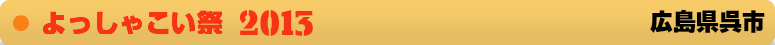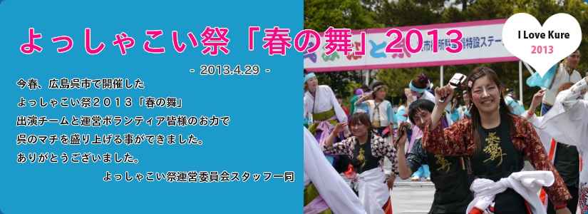| 2013.02.07 | よっしゃこい祭「春の舞」(呉みなと祭)チーム募集スタート! ※呉みなと祭パレードにディズニーがやって来るよ! |
