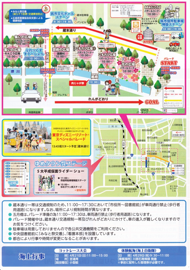 呉みなと祭2013記事2.jpg港町の春を彩る「呉みなと祭」が29日、呉市中心部の蔵本通りなどで開かれた。開園30周年を迎えた東京ディズニーリゾートからミッキーマウスと仲間たちも参加し、沿道を埋めた約35万人(主催者発表)を喜ばせた。 呼び物の市民パレードには20団体約2500人が出演。小学生のトランペット鼓隊やストリートダンスのグループなどが演奏や踊りで盛り上げた。会場周辺には特設ステージやバザールコーナーなども作られ、家族連れらで混雑した。