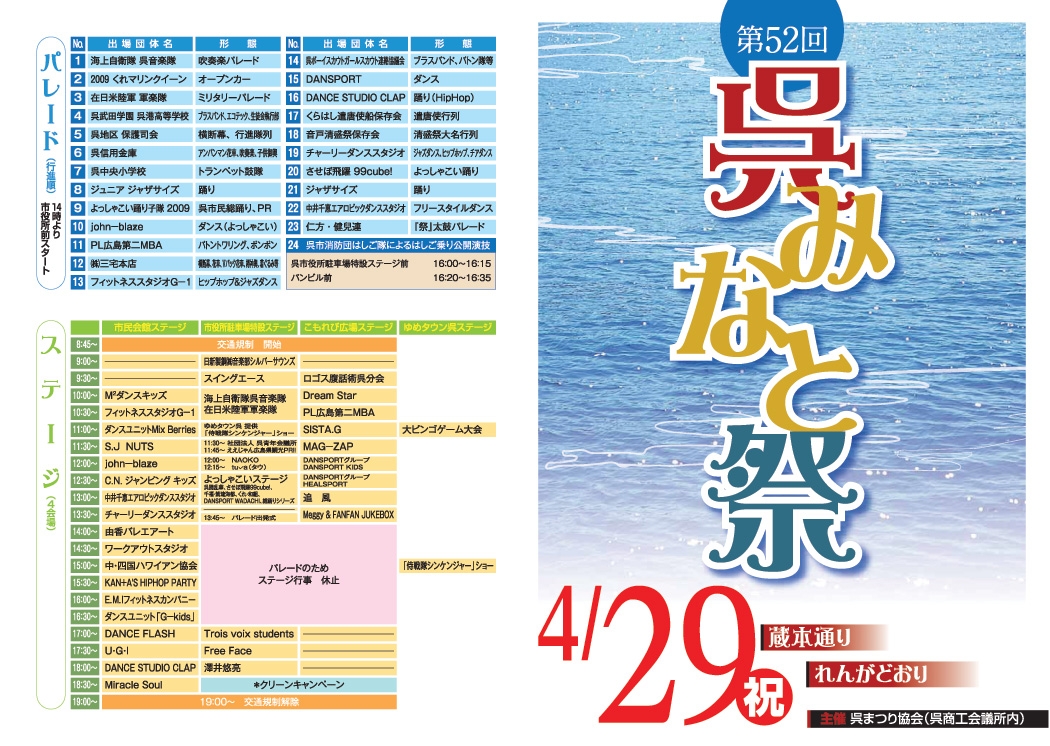 よっしゃこい祭・春の舞出演チーム【ステージ会場】 ■呉市役所駐車場特設ステージ■ DANSPORT-WADACHI くれ・和組 させぼ飛躍 99cube! 呉踊乱華 千福・紫琉海都 音々の会 【パレード会場】 ■蔵本通り〜れんがどおり■ よっしゃこい踊り子隊(一般参加チーム) john-blaze DANSPORT-WADACHI させぼ飛躍 99cube!