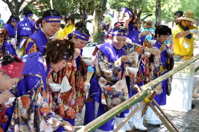 ここは踊り子たちの集いの場!流し細うどんコーナーもあり、 ぜひ、踊り子たちと楽しんで。